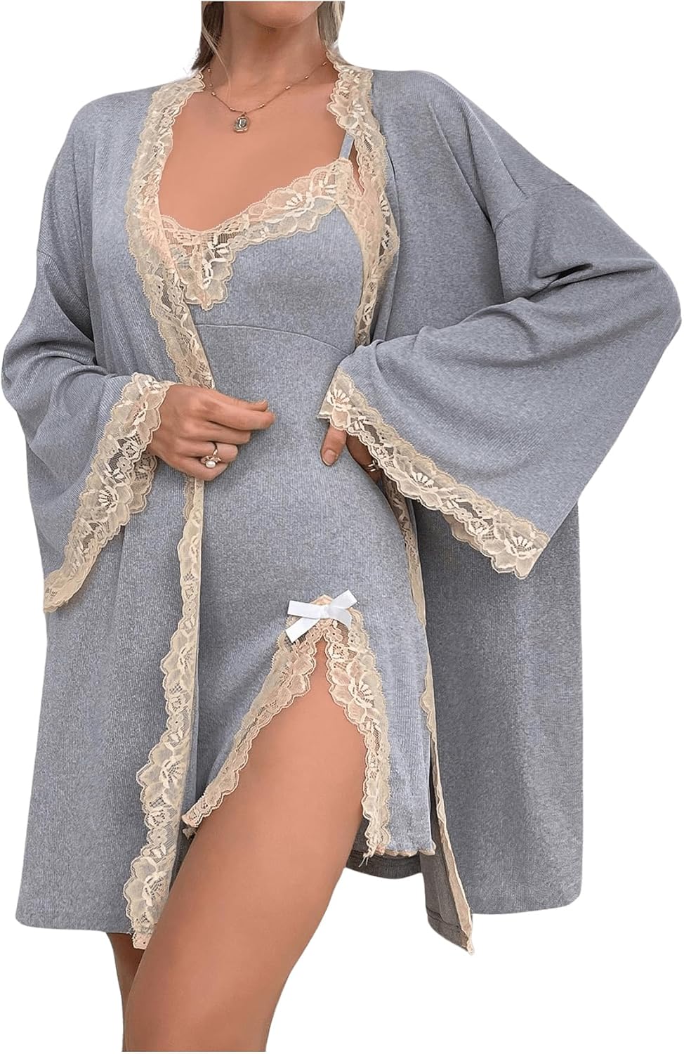 - Features: Two piece nightgown robe sets for women, contrast lace, bow v neck sleeveless spaghetti strap split mini nightdress, long bell sleeve bathrobe with belt