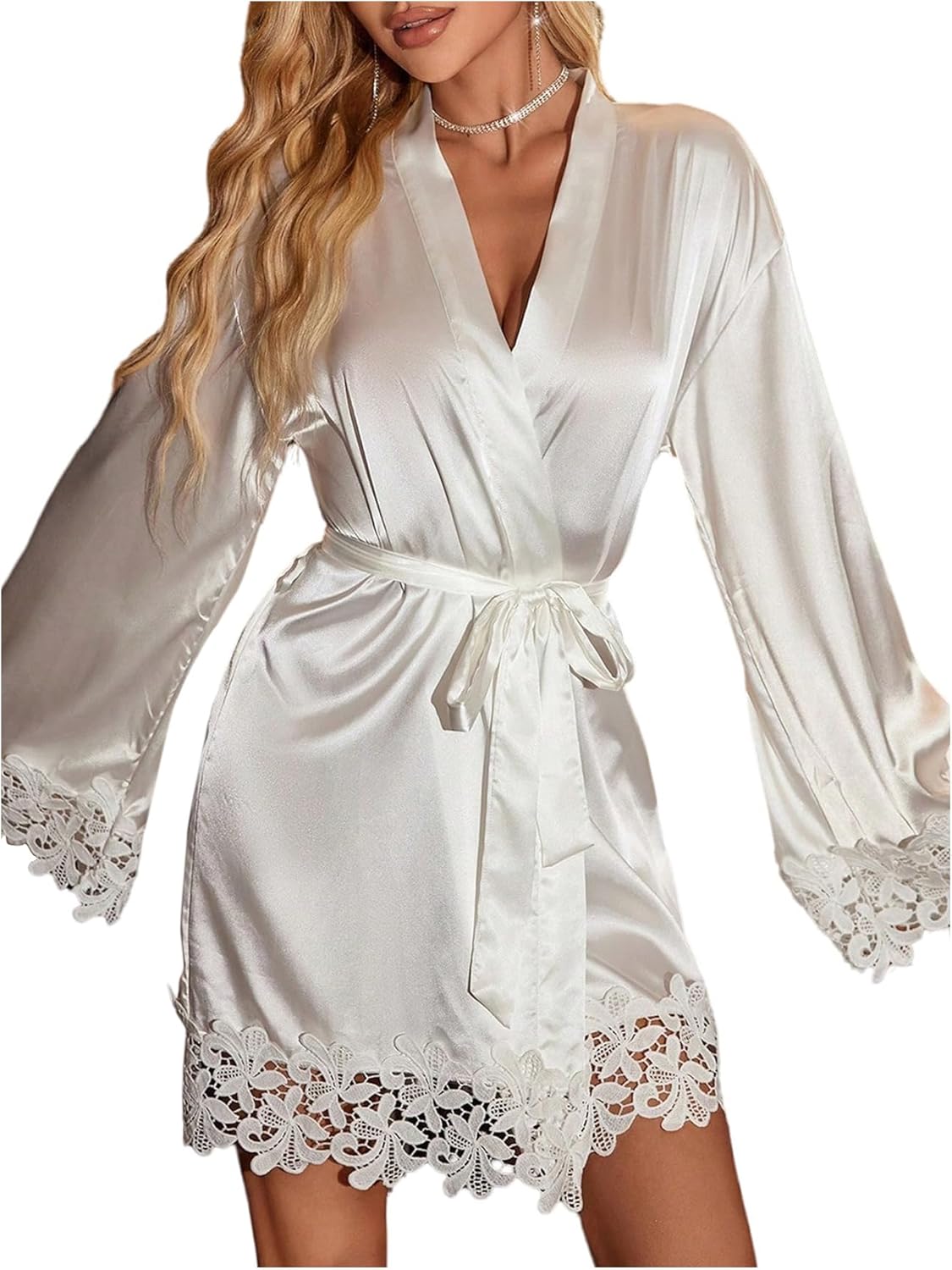 - Comfy sleepwear, satin bathrobe, letter embroidery, lace trim, long sleeve, flare sleeve, wrap front, v neck, belted robe, mini length