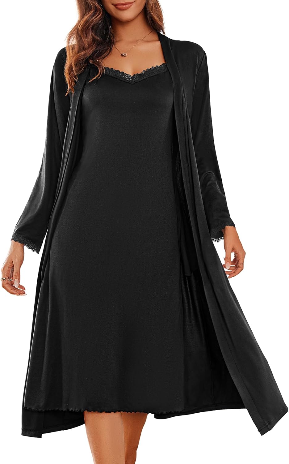 - 【Night Robe】This comfortable and V-neck robe features lace-trim long sleeves wrap design, mid-calf length. Inside tie for a better fit and self-detachable belt for convenience. Two side pockets for holding keys and so on.